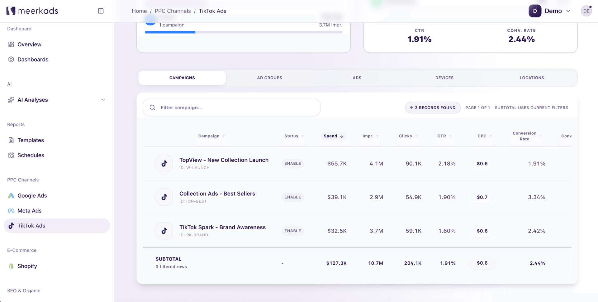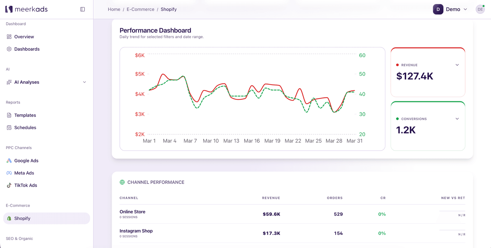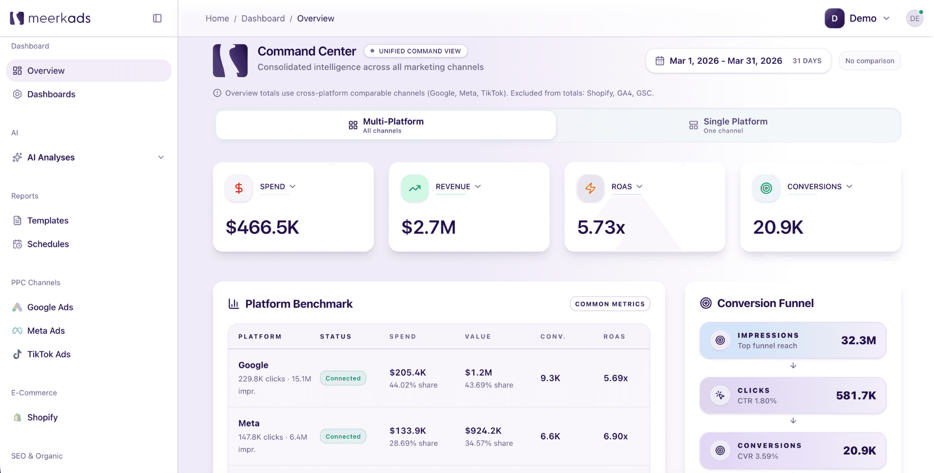 Running ads across multiple channels without a unified analysis layer means every decision is made with incomplete information. Google reports its results. Meta reports its results. TikTok reports its results. None of them account for overlap, none of them use the same attribution logic, and none of them have any incentive to tell you that another channel deserves the credit. The result is inflated reported performance across the board and budgets that flow toward the channels best at claiming conversions rather than the ones genuinely driving them. Meerkads solves this by pulling all your channel data into a single analysis layer where performance is measured consistently, attribution is grounded in actual ecommerce outcomes, and the relationships between channels are visible rather than hidden.